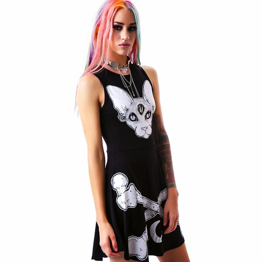 Gothic Cat Moon Slim Mini Dress