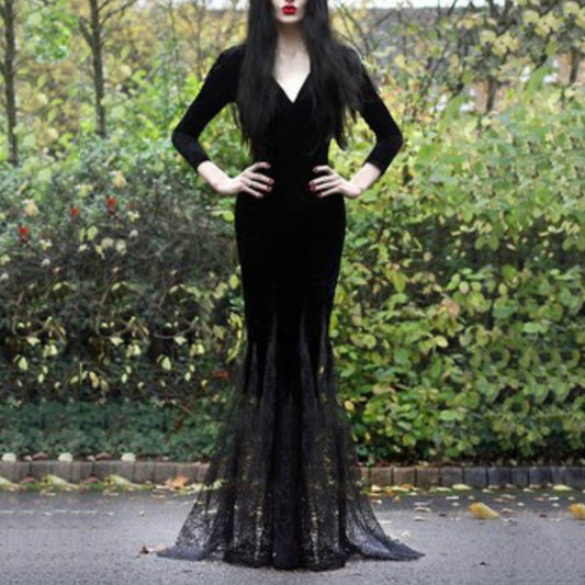 Long Lace Mermaid Halloween Slim Gothic Black Dress Costume