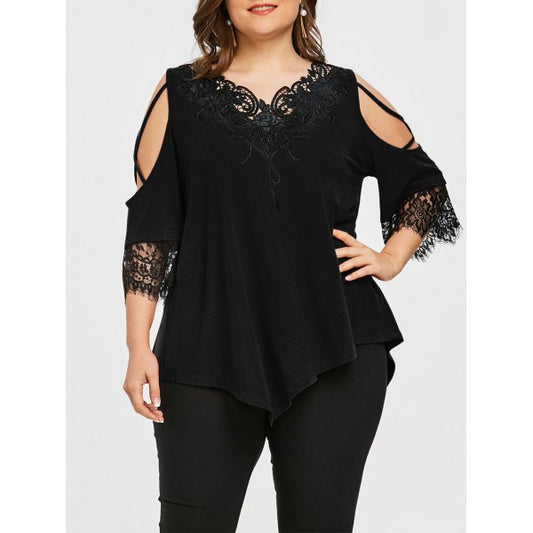 Plus Size Appliqued V Neck Cold Shoulder Gothic Shirt